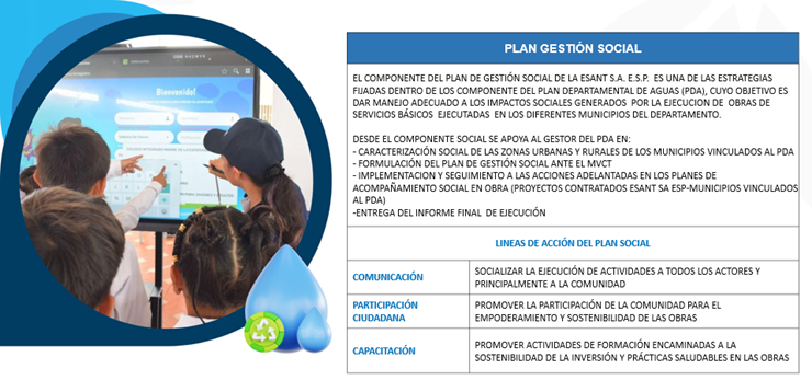 El componente del Plan de Gestión Social de la Empresa de Servicios Públicos de Santander (ESANT S.A. E.S.P.) constituye una de las estrategias clave dentro del Plan Departamental de Aguas (PDA). Su objetivo es gestionar adecuadamente los impactos sociales derivados de la ejecución de obras de servicios básicos en los diversos municipios del departamento. Además, busca que los contratistas de obras civiles cuenten con una herramienta de planificación que asegure la participación activa y el compromiso de la comunidad. De esta manera, se fomenta el empoderamiento y el liderazgo social, lo que facilita la culminación exitosa de los planes y proyectos relacionados con la infraestructura de agua potable y saneamiento básico, garantizando su sostenibilidad dentro del marco de la prestación de los servicios domiciliarios en Santander